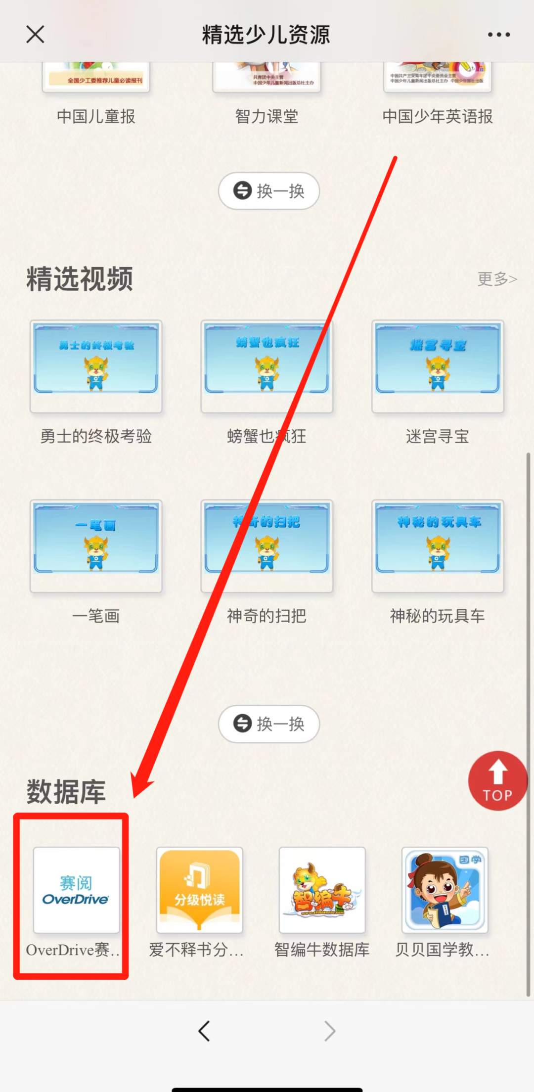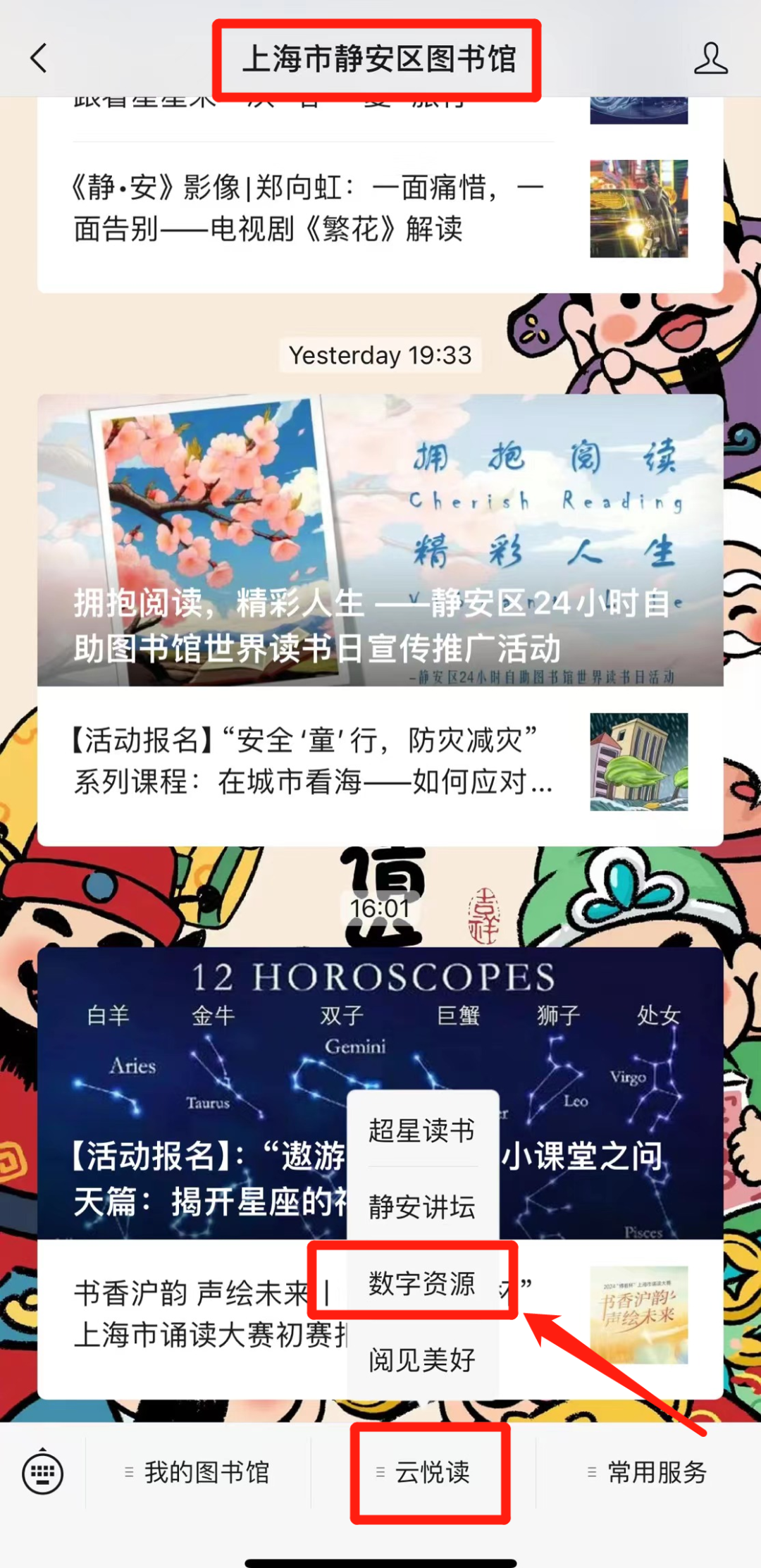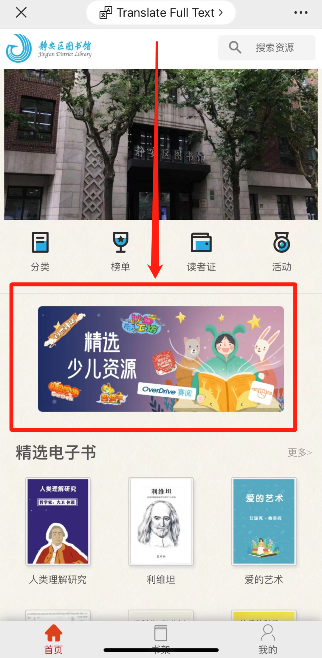 方式三:关注“上海市静安区图书馆”公众号,点击下方“云悦读”——选择“数字资源”,在新页面中间,点击图片“精选少儿资源”——“数据库”——选择“OverDrive赛阅数字图书馆”