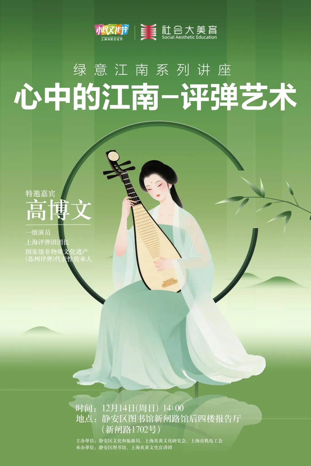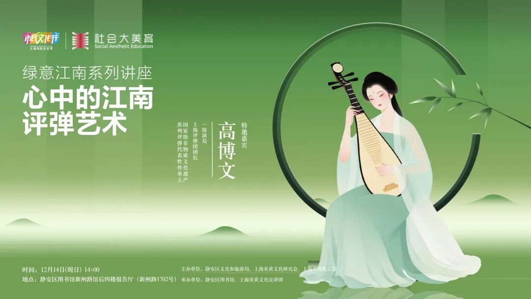 12月14日,“绿意江南”系列讲座收官之讲,特邀一级演员,上海评弹团团长,国家级非物质文化遗产(苏州评弹)代表性传承人高博文主讲。围绕评弹这一“中国最美的声音”,系统介绍其起源、发展、分类及其与江南社会的紧密联系。并通过《姑苏好风光》《莺莺操琴》《蝶恋花·答李淑一》等经典唱段展示其艺术魅力。活动还将探讨评弹在流行地域外的影响力、创新融合之路,以及成功人士对其的感悟与热爱,带领读者全方位领略评弹艺术的深厚底蕴与时代活力。