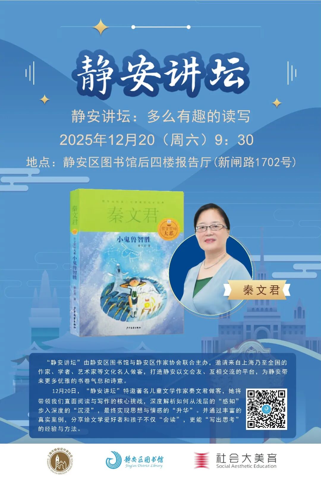 12月20日,“静安讲坛”特邀著名儿童文学作家秦文君做客,她将带领我们直面阅读与写作的核心挑战,深度解析如何从浅层的“感知”步入深度的“沉浸”,最终实现思想与情感的“升华”。并通过丰富的真实案例,分享给文学爱好者和孩子不仅 “会读”,更能“写出思考”的经验与方法。