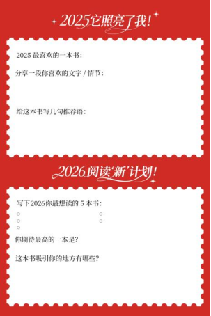 读者可以自由发挥创意,用文字、绘画、贴纸、干花等元素装饰这张独一无二的“阅读卡片”,制作属于你的阅读记忆。完成制作后,拍照上传至活动抽奖页面,即可参与“你期待最高的一本书”抽奖!我们将抽取3名读者,助力2026年阅读计划心愿成真!