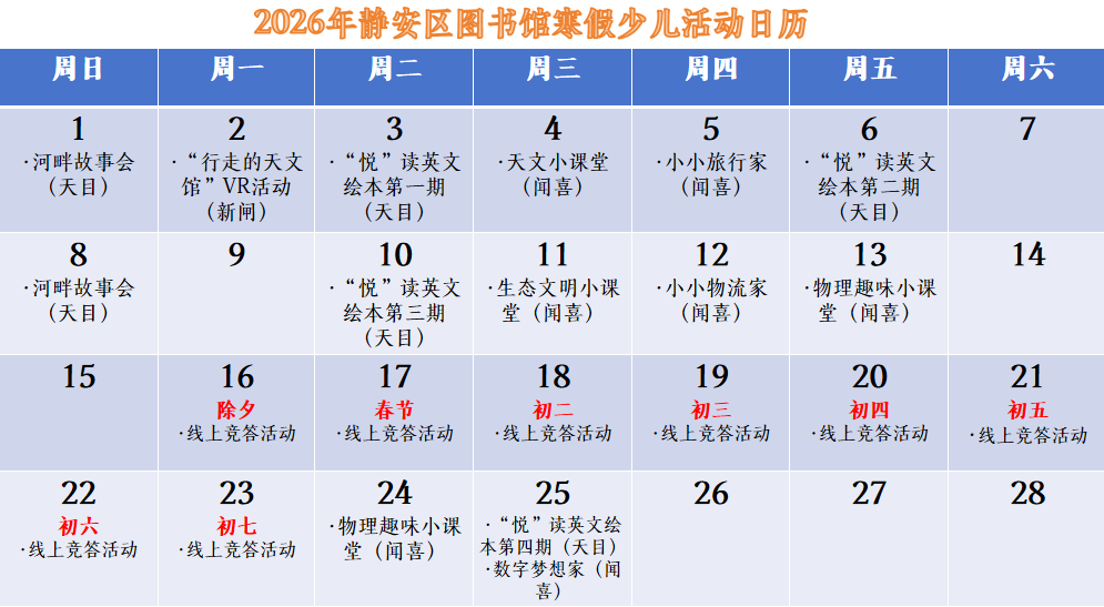 1.寒假活动需提前报名。具体报名信息将于每场活动开始前3—5天在上海市静安区图书馆微信公众号发布,敬请留意!