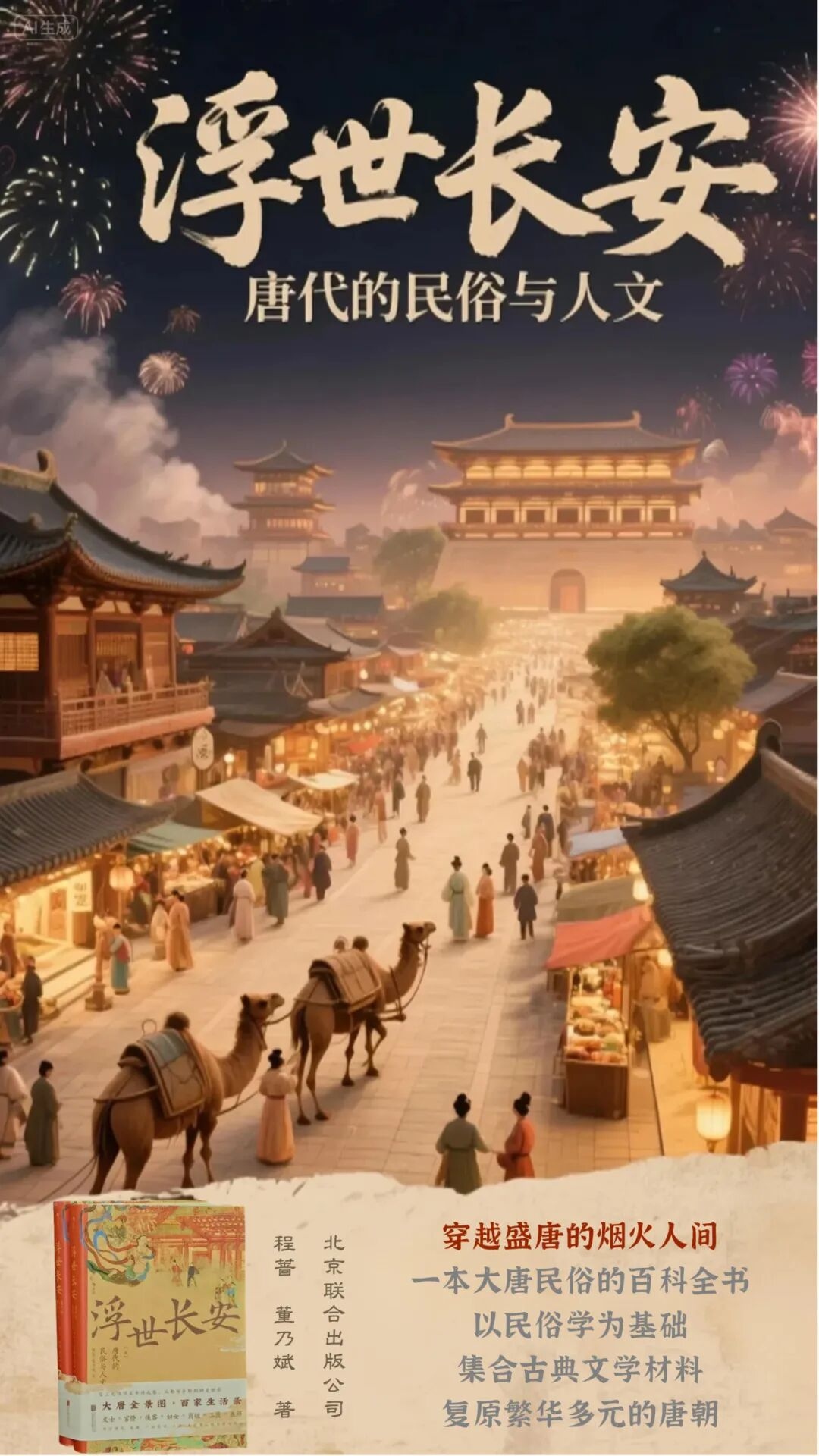 《浮世长安:唐代的民俗与人文》是一部全景式展现唐代社会生活的百科全书,海报以长安西市为蓝本,借鉴《大唐盛景图卷》的恢弘构图与敦煌壁画的瑰丽色彩,呈现上元灯节华灯如昼、人声鼎沸的盛唐气象,刻画了骆驼商队、坊间生活等场景,突出市井烟火气。通过恢弘的视觉语言,让千年前的盛唐繁华跃然眼前,带领读者穿越时空,感受开放包容的大唐气度。