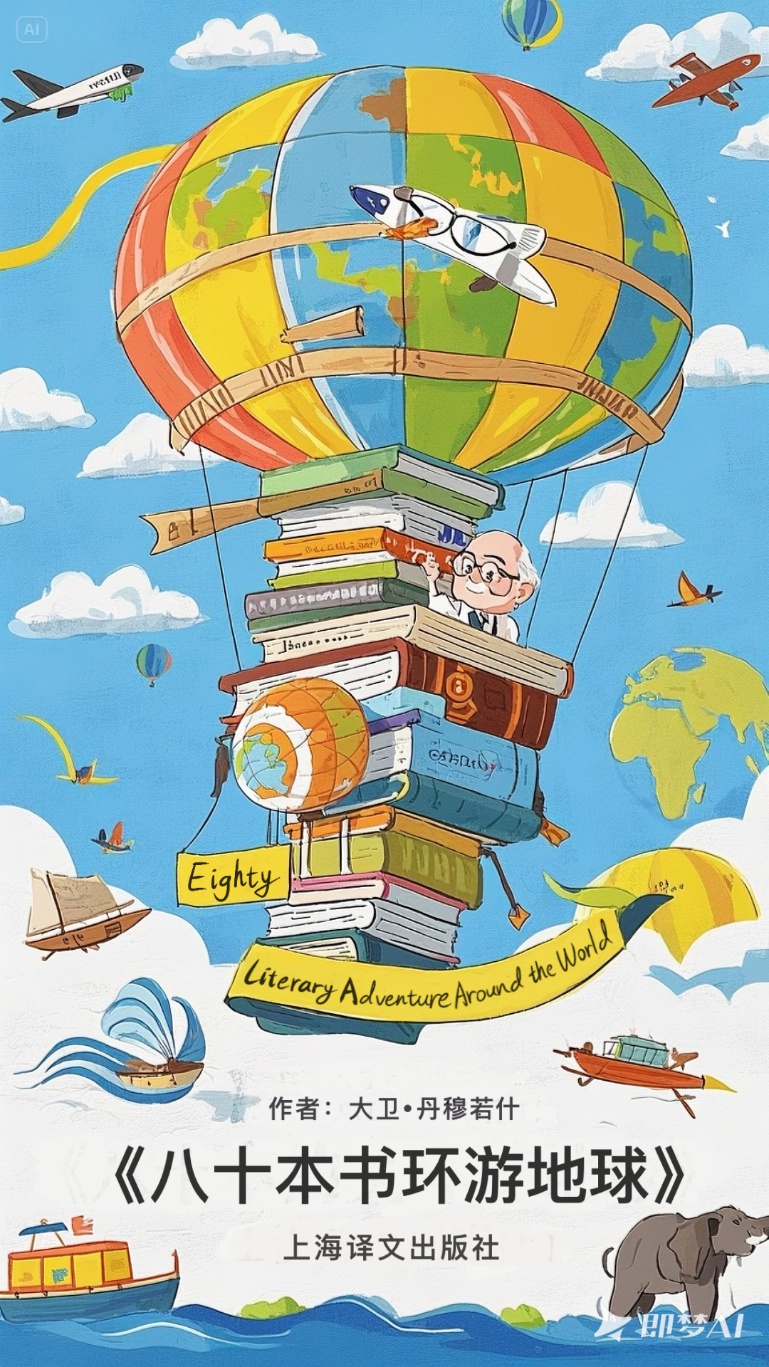 《八十本书环游地球》是哈佛大学教授大卫·丹穆若什的80堂文学课,由上海译文出版社2024年出版。海报中心以书本堆叠成热气球形状,吊篮里坐着丹穆若什教授卡通形象:戴眼镜,手持钢笔和地球仪;周围以书中经典元素作为点缀,生成色彩明亮的活泼手绘风格海报,富有童趣。