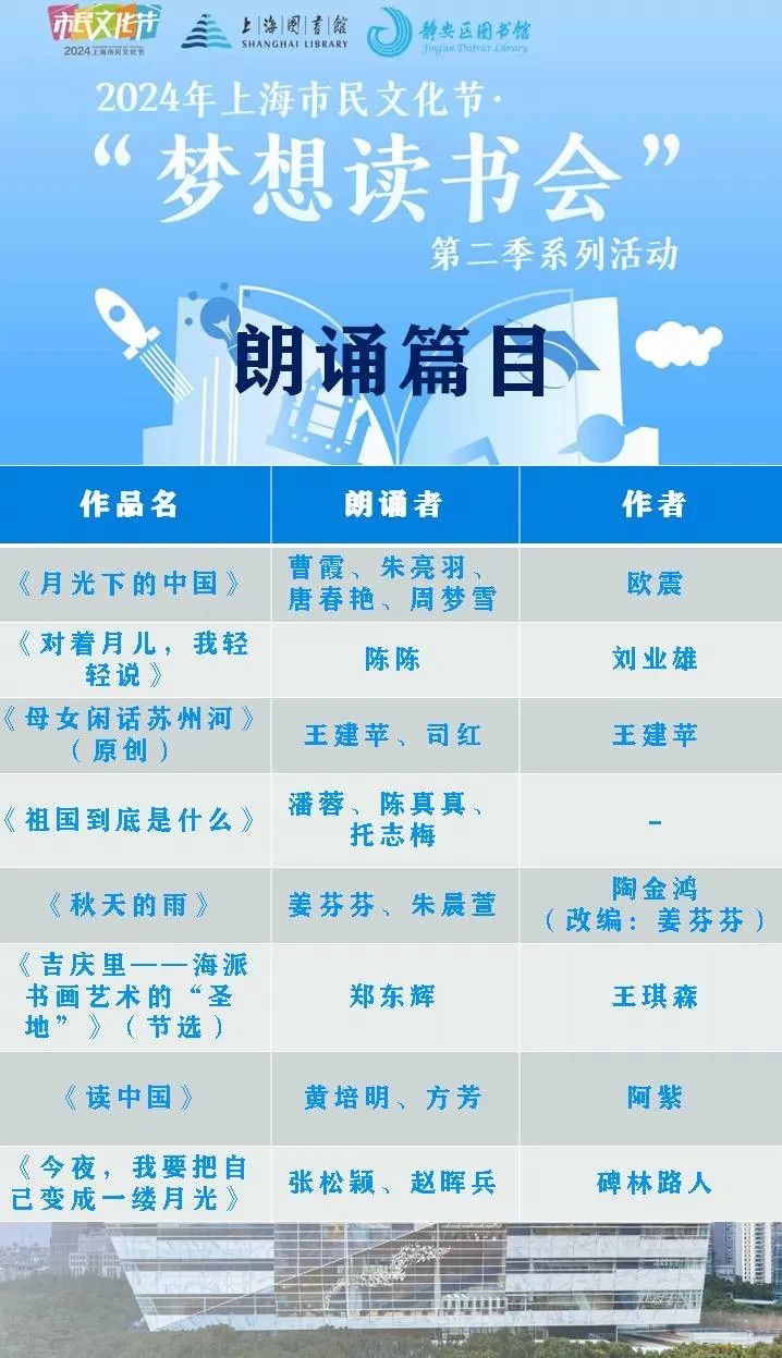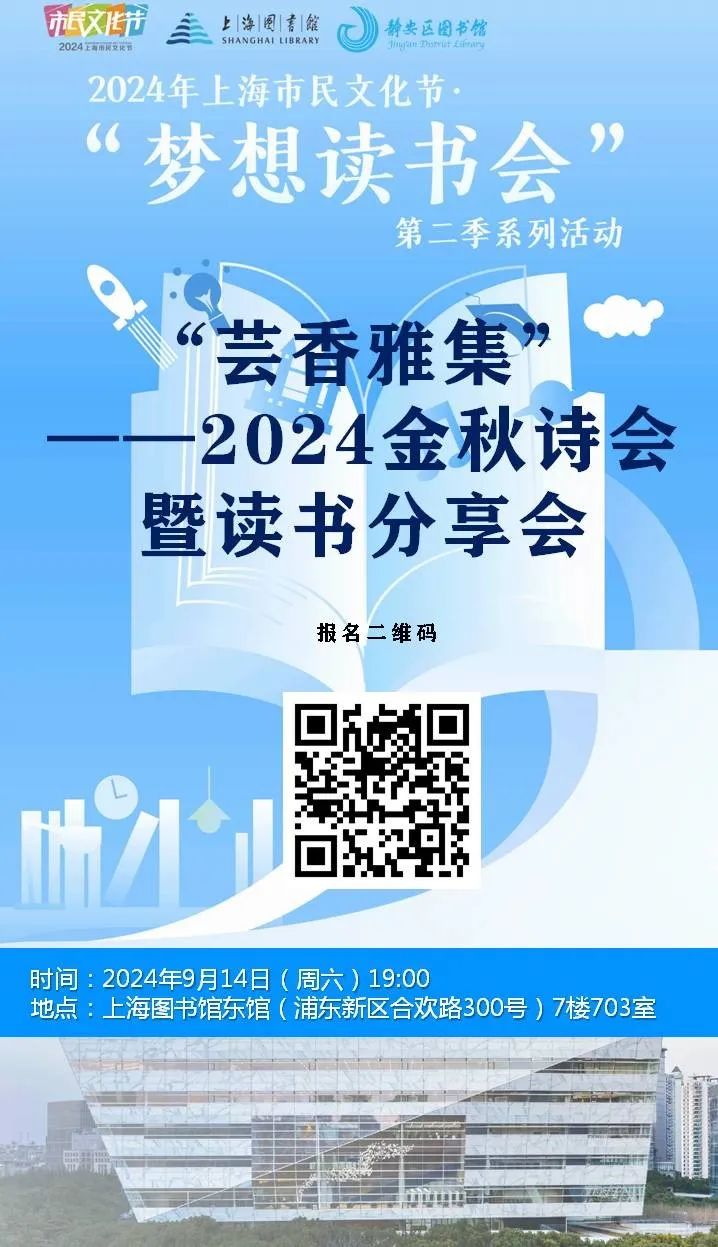 9月14日(周六)晚,上海市静安区图书馆静安白领朗诵沙龙将于上海图书馆东馆举办“芸香雅集”——2024金秋诗会暨读书分享会。此次诗会暨读书分享会也是静安白领朗诵沙龙作为2024年上海市民文化节“梦想读书会”第二季参评读书组织所开展的线下活动。