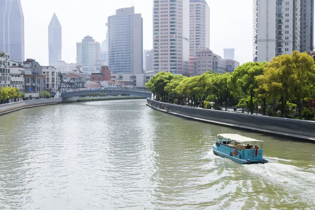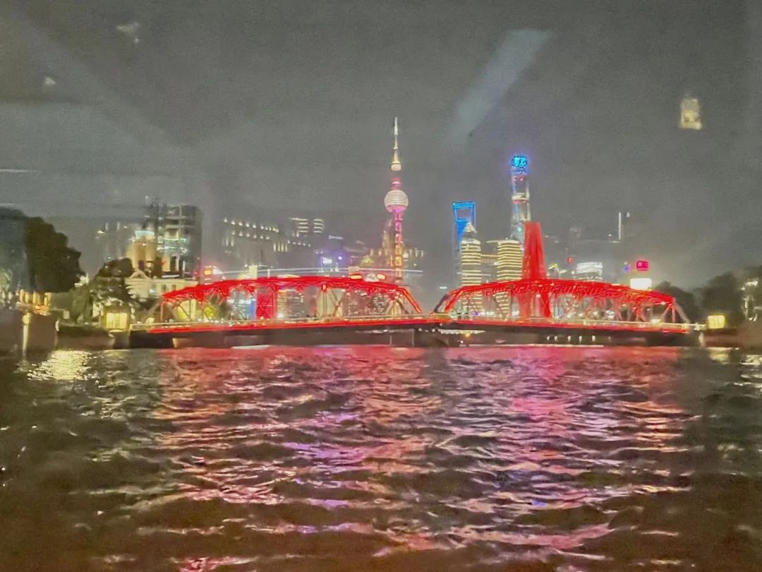 夜色微暗、灯火阑珊之时,游船从四行仓库码头悄然驶离,贴水而行,春水浩荡。向西途经乌镇路桥、新闸路桥、成都北路高架桥、恒丰路桥、昌平路桥、普济桥、长寿路桥、昌化路桥,然后在河面宽阔的天安千树建筑前悠然划了一个180度大转弯,向东重又穿越这些桥,再驶过西藏路桥、浙江路桥、福建路桥、山西路桥、河南路桥、四川路桥、乍浦路桥,直到中外闻名的外白渡桥。刹那间,浦江两岸霓虹闪烁、缤纷斑斓,恍若进入仙境。很快,游船折返,苏州河水依旧平缓、静谧,就像躺在母亲的怀抱,沉沉欲眠。
