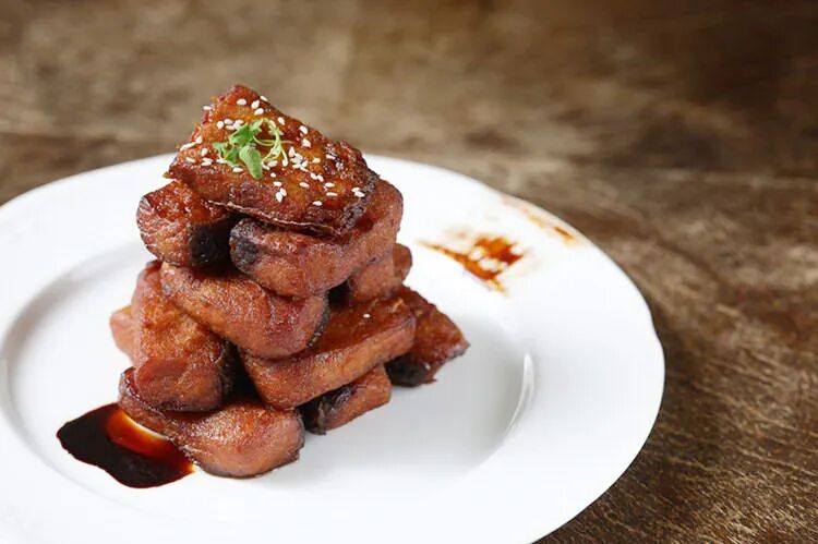 红烧肉在上海菜里与其说是一道菜,不如说是一种记忆,咀嚼时令人想起慈祥而善持中馈的老外婆。他家厨师用鲜鲍和松露来增加红烧肉的内涵,以每人一具袖珍小砂锅的规格上桌。当你正要享用时,服务员手持黑松露赶来,当场削两片在红烧肉上。你可一边欣赏松露切面的大理石花纹,一边打开鼻翼,尽情地吸入受热后徐徐散发的奇异香味,然后大快朵颐吧,连最后一粒拌了肉汁的米饭也不要浪费。