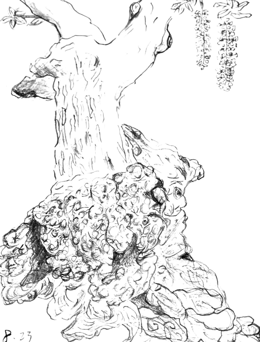 隔了两年,也就是2021年3月23日,我又来画它,顺便又问问路过停顿的人,结果照例没人知道。我画了几笔,突然没了耐心,只画了个大概的外貌,树瘤像一堆莫名的垃圾堆积其上,但树上蹿出的嫩枝特征却被我抓住了,它真实地记录了老树春天的萌芽状态。之后我再也没有见它,可心里还是经常浮现出那一大堆瘤子的样子,还不时思索它的形成原因,它为什么会有如此巨大的疙瘩呢?是露在外面的树根伸展不开,被路石挤压憋屈成团状吗?或者是受到什么严重的虫害,痊愈后增生留下的瘤状组织?抑或同样被车撞过,在自我修复后形成了良性树瘤?不知它究竟经历了怎样的伤害才活成了今天的模样?
