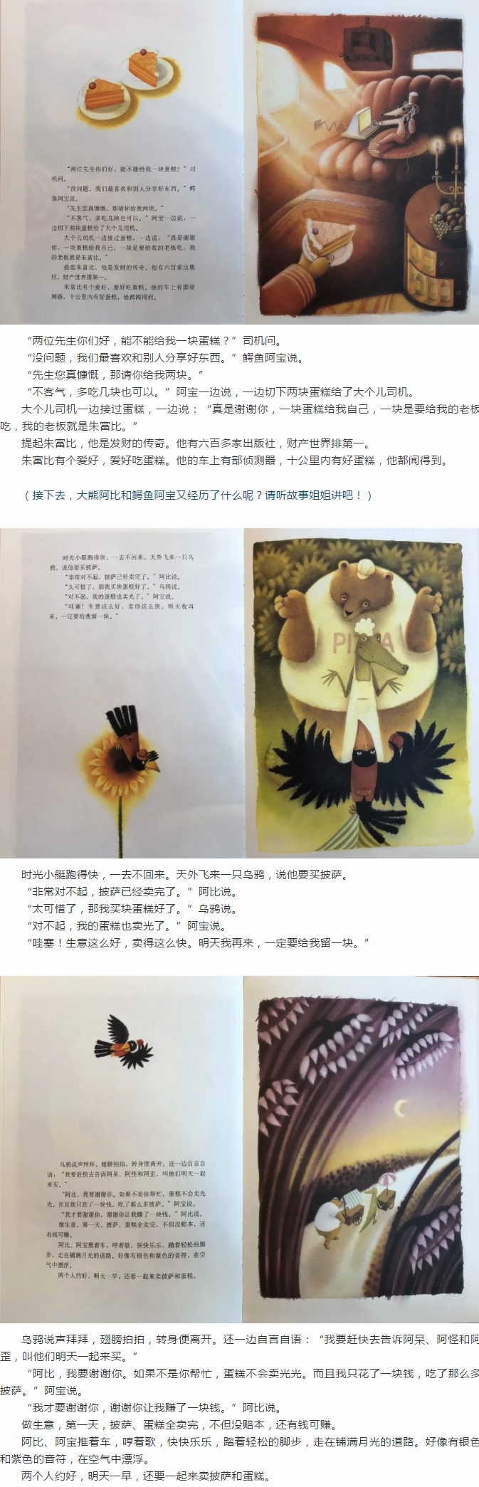 一只最会做披萨的熊,和一只最会做蛋糕的鳄鱼,一起做生意,是熊赚得多,还是鳄鱼赚得多呢?这个故事讲述了会做披萨的大熊阿比和会做蛋糕的鳄鱼阿宝,这对好朋友一起做生意的故事。一个让你会心一笑的故事,经过意大利插画家朱里安诺魔法彩笔的挥洒,带你进入一个温暖、多彩又梦幻的童话世界。分享是让料理更美味的魔法调味,更是让友谊常保新鲜的绝妙处方!该书首版于1998年,迄今在我国台湾地区已经再版27刷,并在各个国家和地区出版有九种语言的版本。