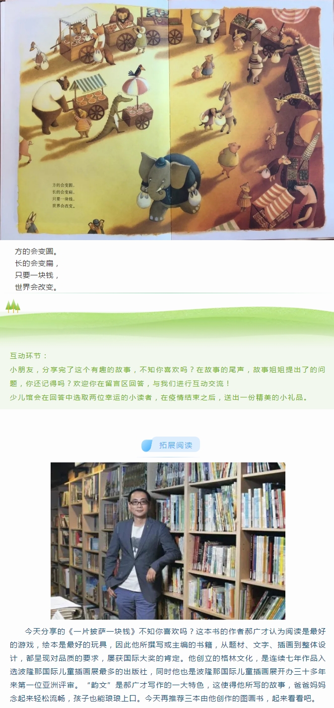 今天给大家带来“河畔故事会”第四十二期的线上分享,我们一起阅读绘本《一片披萨一块钱》。本书作者是我国台湾著名绘本作家郝广才,绘者是意大利绘本创作家朱里安诺。